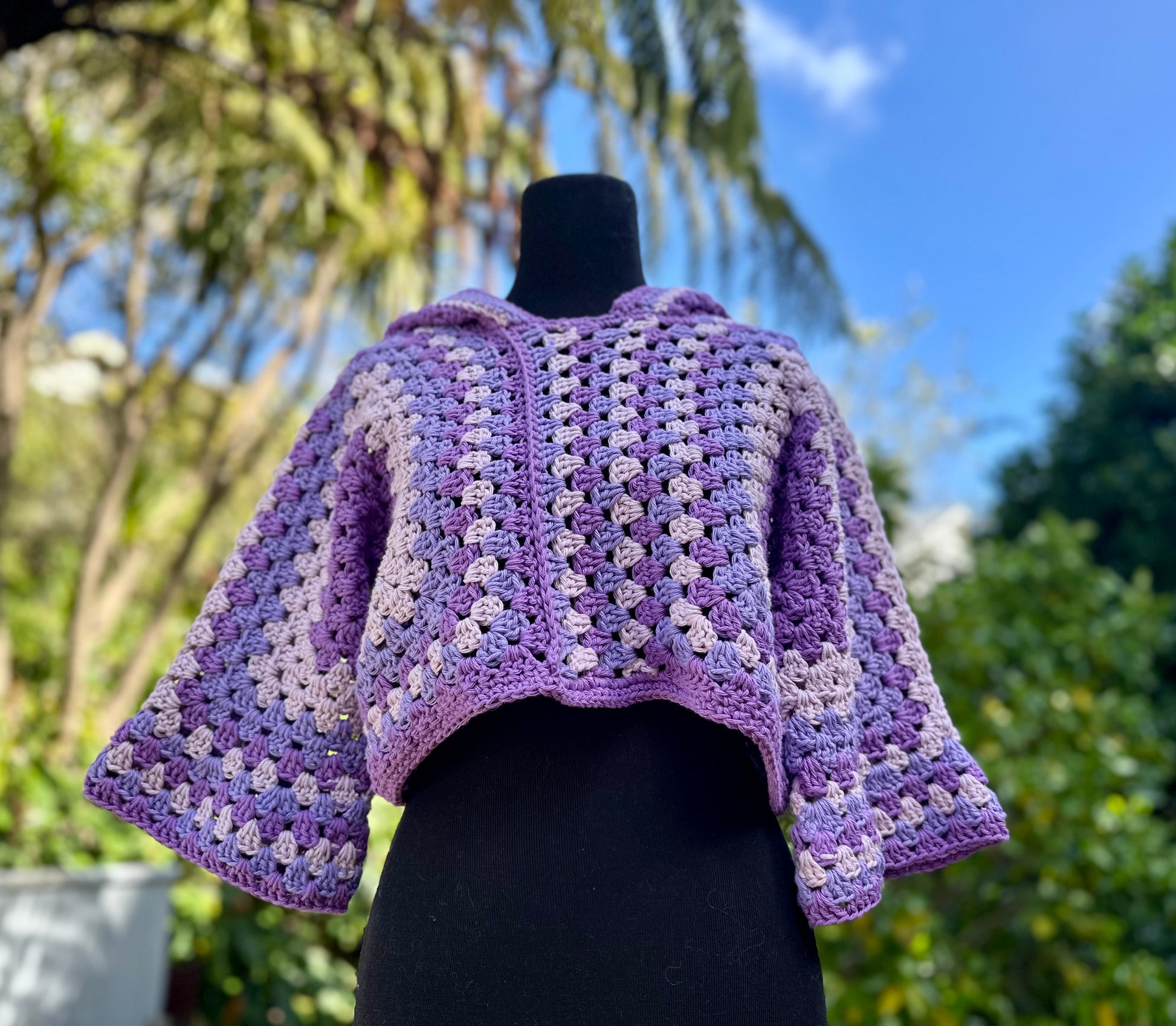 Hand crocheted cotton 3/4 length sleeve hoodie.